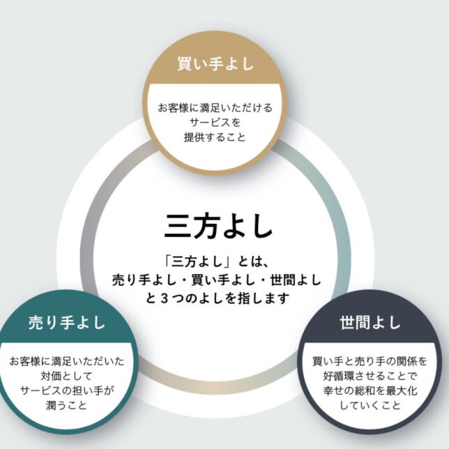 経営哲学のひとつとして「三方よし」が広く知られています。「商売において売り手と買い手が満足するのは当然のこと、社会に貢献できてこそよい商売といえる」という考え方です。